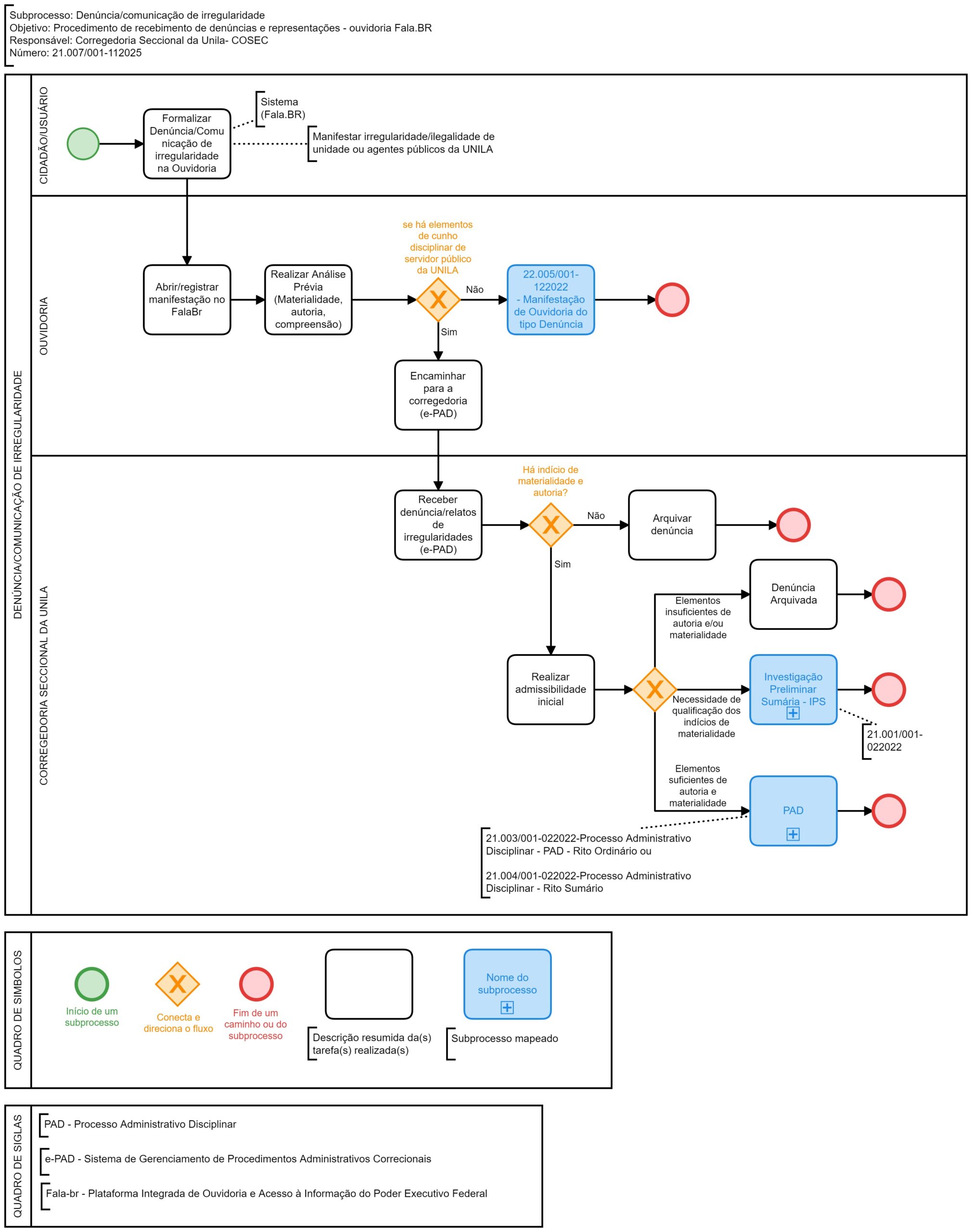 | Gestor do Subprocesso | Corregedor(a) da Corregedoria Seccional da Unila |