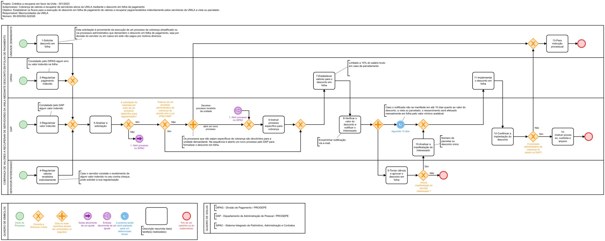 Objetivo: Estabelecer os fluxos para a execução do desconto em folha de pagamento de valores a recuperar pagos/recebidos indevidamente pelos servidores da UNILA a vista ou parcelado.